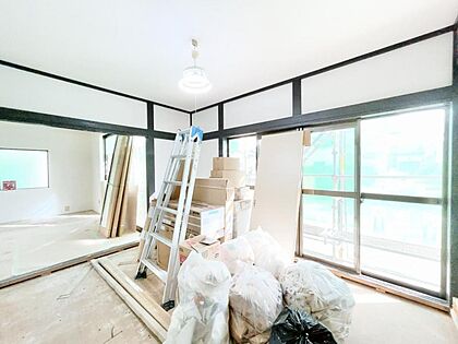 【内外装リフォーム中10/18更新】リビングを別角度で撮影致しました。二面採光に加えて、お庭側が南向きでお部屋に暖かく明るい光が差し込みますね。天井壁クロス貼り替え、フローリング重ね張り、照明交換、他