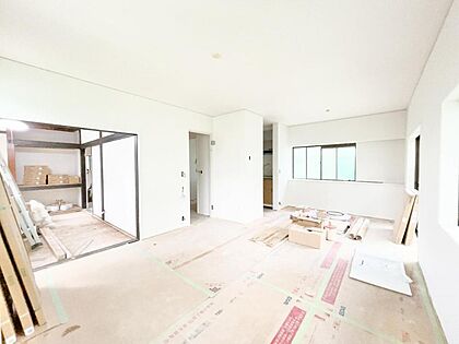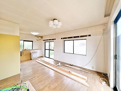 【内外装リフォーム中10/18更新】LDKを撮影致しました。大きな窓があるので、明るく過ごしやすい空間になっています。クロス貼り、フローリング重ね張り、LED照明交換、ダウンライト設置、他。