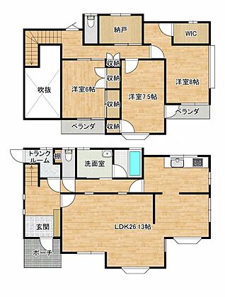 【間取り図】間取りは使いやすい3SSLDKの間取り。周りに遮るものがないので日当たりの良いおうちです。二階に3部屋と納戸、ウォークインクローゼットありますので、収納には困りませんね。