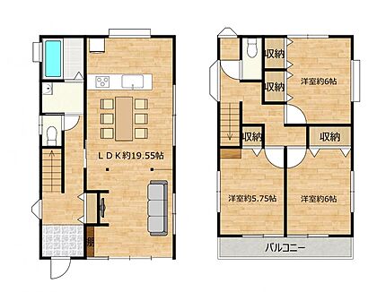 RF後の間取図です。全階層にトイレがある3LDKのお家です。想定で家具を設置しております。