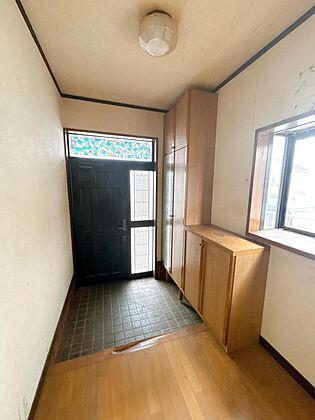 【リフォーム中】玄関の内観です。タイル・クロス張替、クロス仕上げ、照明・シューズボックスの交換を行います。