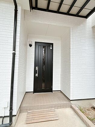 玄関のお写真です。上部にはバルコニーがございますので、雨に濡れることなく準備ができていいですね。