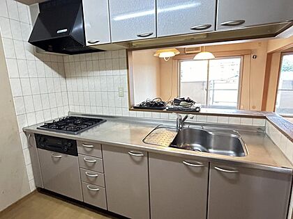 【キッチン】キッチンは対面式で、吊戸式の収納も備えています。都市ガスなので経済的です。