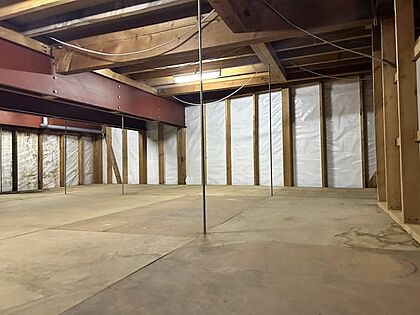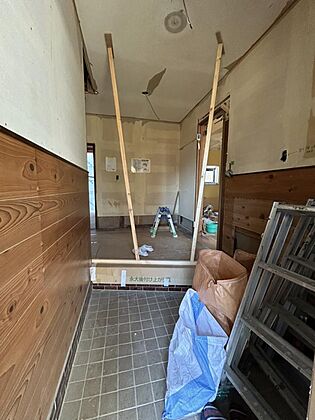 【約8.5帖洋室別アングル リフォーム中】大きなクローゼットと、開口部分が大きく開放的な掃き出し窓が特徴的なお部屋です。天井・壁クロス、フローリング重ね張りを行います。照明器具はLED照明へと交換いた