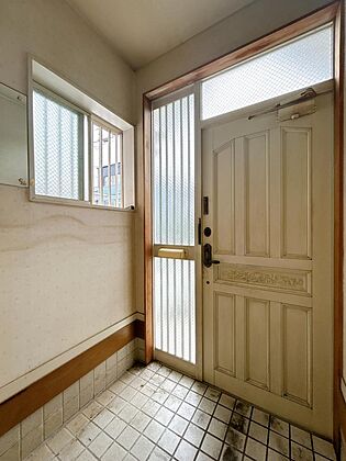 【リフォーム中】玄関ホール 玄関上の明かり取りと小窓から光が差し込み明るい印象の玄関です。気持ちまで明るくしてくれますね。
