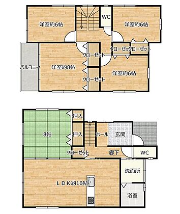 【間取り】5LDkのお家になります。1Fには16帖のリビングと8帖の和室がございます。2Fには洋室が4部屋ございます。