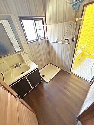 洗面脱衣室写真。ファーストプラス製の洗面化粧台に新品交換いたします。