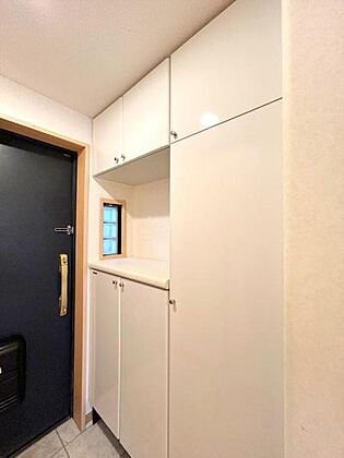 玄関収納 天井までの高さがあり、玄関廻りもすっきり片付きそうです。