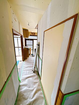 【リフォーム中。10/25撮影】玄関入ってすぐの廊下です。床はフローリング張し、壁・天井をクロス張りします。