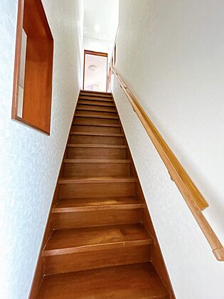 【リフォーム済】階段はクロス張替え、手すり設置、照明器具・火災警報器設置を行いました。手すりがあるとお子様の上り下りも安心ですね。