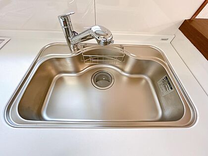 【リフォーム済】新品交換したキッチンのシンクはサビにくく熱に強いステンレス製です。水はねの音を抑える静音設計で、従来よりもさらに水音が静かになっています。