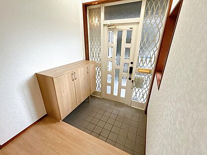 【リフォーム済】玄関はシューズボックス設置、クロス張替え、照明器具交換を行いました。シューズボックスを新設したので、靴のお片付けもラクラクです。
