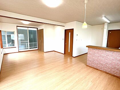 【rリフォーム済】リビングはフローリング上張り、クロス張替え、キッチン・照明器具・扉交換、火災警報器設置を行いました。空間を広々使えるL字リビングです。