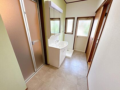 【リフォーム済】洗面脱衣室は洗面化粧台交換、クッションフロア張、クロス張り、建具の扉・照明交換を行いますした。キッチンからも廊下からも入れるので、家事がしやすい動線です。