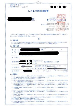 シロアリ防除には5年間の保証付き(施工日から。施工箇所のみ施工会社による保証)