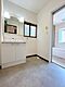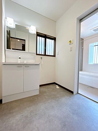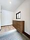 •  【リフォーム済】1階洗面室写真です。洗面化粧台は新品に交換いたしました。床は、クッションフロアの重張りを行いました。