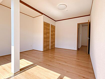 【リフォーム済】2階西側の約8帖の洋室です。天井・壁のクロスを張り替えて床はフローリングを張替えました。採光が南向きなので、冬でも部屋の奥まで日が当たります。