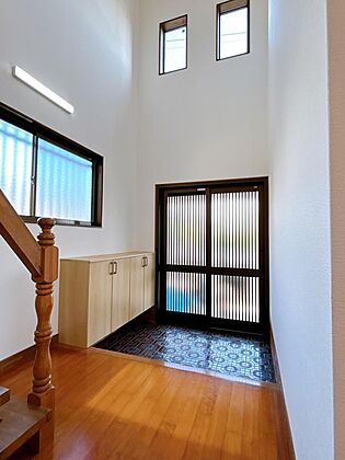 【リフォーム済】玄関です。シューズボックスを新設しました。吹き抜けになっており開放感と明るさがありますね。