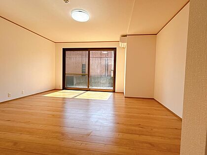 【リフォーム済】リビングです。壁、天井のクロスを張り替え、床はフローリングを張り替えました。南の大きな窓からやわらかな日差しがそそぎ、明るいLDKです。