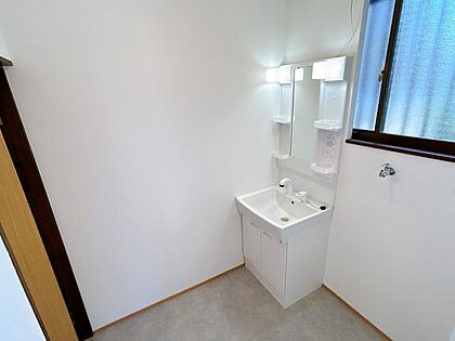 【リフォーム済】洗面室の写真です。洗面台及び洗濯用水栓は新品に交換しております。収納棚もついているのでスッキリしそうですね。