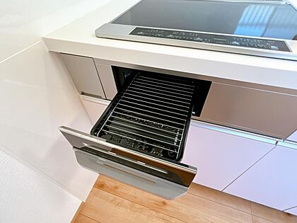 【リフォーム済】新品交換したキッチンにはグリルが備わっております。上に3口コンロもあるので、料理の幅が広がって嬉しいですよね。様々な料理をお楽しみください!