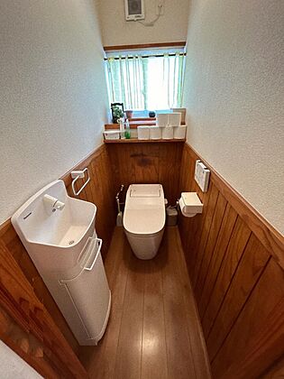 【トイレ写真】トイレは便利なウォシュレット付き。背面には便利な簡易棚もあるのでちょっとした小物も置けます。簡単なインテリアにもなりますね。
