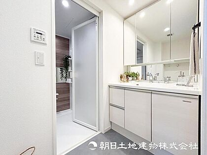【洗面化粧台】落ち着いた清潔感のある空間は、身だしなみチェックや肌のお手入れに最適です。収納も十分でゆとりを持たせます。