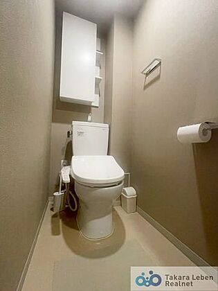 ウォシュレット機能付きのトイレ。上部には吊戸棚があるので、トイレットペーパーのストックや清掃道具等を収納するのに便利です。