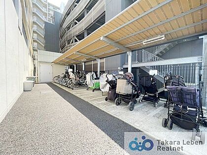 大きめなベビーカーは屋外の屋根付きベビーカー置場へ。専用スペースがあるのでお部屋の玄関回りもすっきりと整理が可能です。