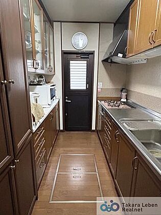 •  1階キッチン。収納力豊富なキッチンボード付きです。勝手口もついており、気になるゴミの臭い対策も安心です。