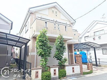落ち着いた色合いとモダンなデザインが印象的な戸建外観。道路からの見通しもよく、しっかりとした門構えが安心感を与えます。周囲との距離も程よく確保されており静かな環境です。堂々とした佇まいが魅力◎。