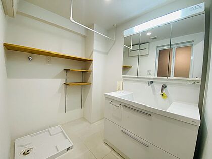 白を基調とした清潔感溢れる空間。棚付きで使い勝手○