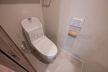 吊戸棚にトイレットペーパーやお掃除道具などもスッキリ収納可能。パワー脱臭機能などを備えた温水洗浄便座付きトイレです。