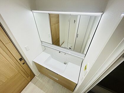洗面化粧台新品交換済み!大きな鏡とたっぷりの収納で使い勝手がいいですよ♪