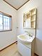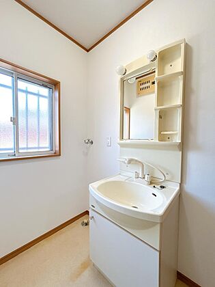 【リフォーム済】洗面所の写真です。クッションフロア張替え・クロス張替え・照明交換等行いました。