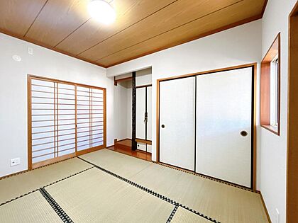 【リフォーム済】1階の和室写真です。畳の表替え、ふすまの張替を行いました。リビングとの続き間となっておりますので、皆様でゆっくりとお過ごしいただけます。