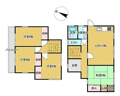 【リフォーム済】間取り図です。リビングは約12帖、2階の居室はすべて洋室となっており、使い勝手の良いお家となっております。