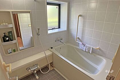 浴室です。大きな浴槽で、換気窓と転倒防止用の手すりが付いているのがうれしいポイント。