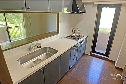 キッチンです。使いやすいシステムキッチンで、3口コンロや食器洗浄機、浄水機能も付いています。勝手口があり、換気しやすいのもうれしいポイント。