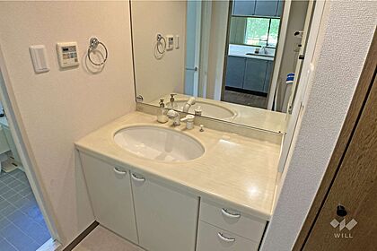 洗面室です。大きな鏡が特徴的で、収納スペースも充実しています。廊下とキッチンから出入りできます。
