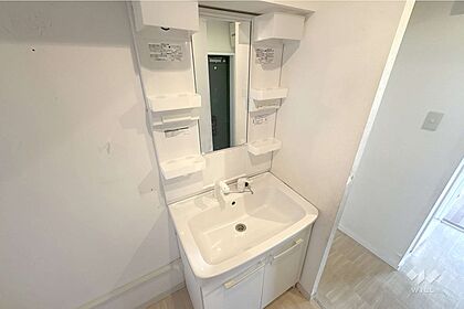 •  洗面室です。コンパクトな洗面室ですが、シンク下に収納スペースが付いているので便利です。