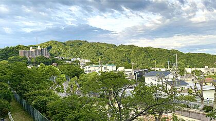 •  バルコニーからの眺め(北東方向)です。春から夏にかけて、鮮やかな緑が映える景色が楽しめます。[2025年5月27日撮影]