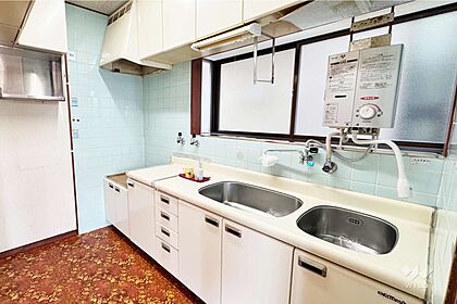 レトロな雰囲気の残るキッチンです。生活感のでにくい独立型で、シンクが2つあります!換気窓があるのもうれしいポイント。[2025年6月27日撮影]