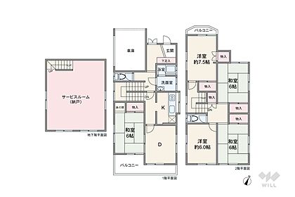 間取りは延床面積149.04?の5SLDK。全居室6帖以上のゆとりある造りになっています。採光部が多く、水廻りには換気窓が付いているため風通し良好です。地下1階部分には納戸があります。