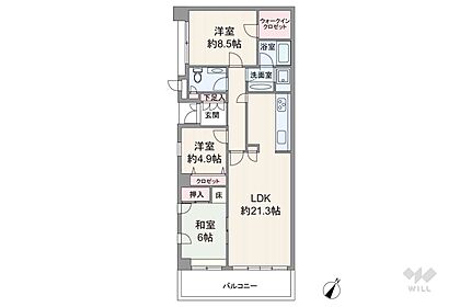 間取りは専有面積97.29平米の3LDK。広々としたLDK約21.3帖のプラン。キッチンは家事動線に優れた2WAY仕様です。全居室に収納があり、主寝室にはウォークインクロゼット付き。