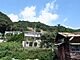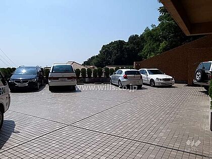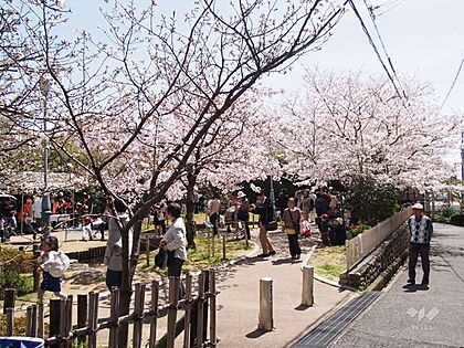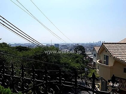 ロワ・ヴェール岡本の遠景。周辺は緑豊か。マンションと一戸建てなどが混在しています。