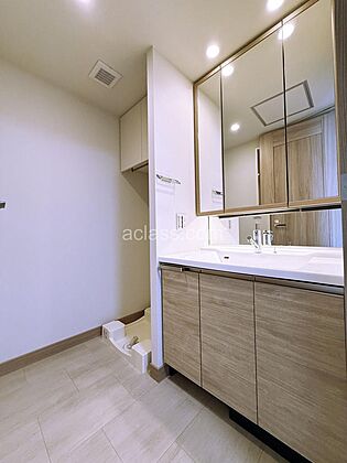 きれいな洗面室です。三面鏡の裏には収納空間があります。