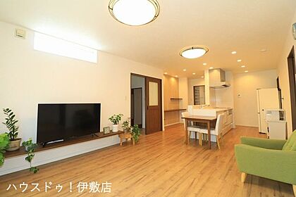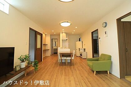 •  【リビング】明るい木目調フローリングと白のクロスを基調とした空間が調和。キッチンからリビングまで見渡せる開放感あふれる間取りで、家族の会話が弾みます。