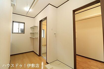 【洗面所】広々とした洗面所には物干し金具がついており、室内干しが可能です!隣がウォークインクローゼットとなっており、すぐに収納も可能!