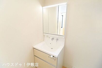 【洗面台】棚付きの洗面台。広い洗面ボウルでは楽にシャンプーや手洗い洗濯ができます。